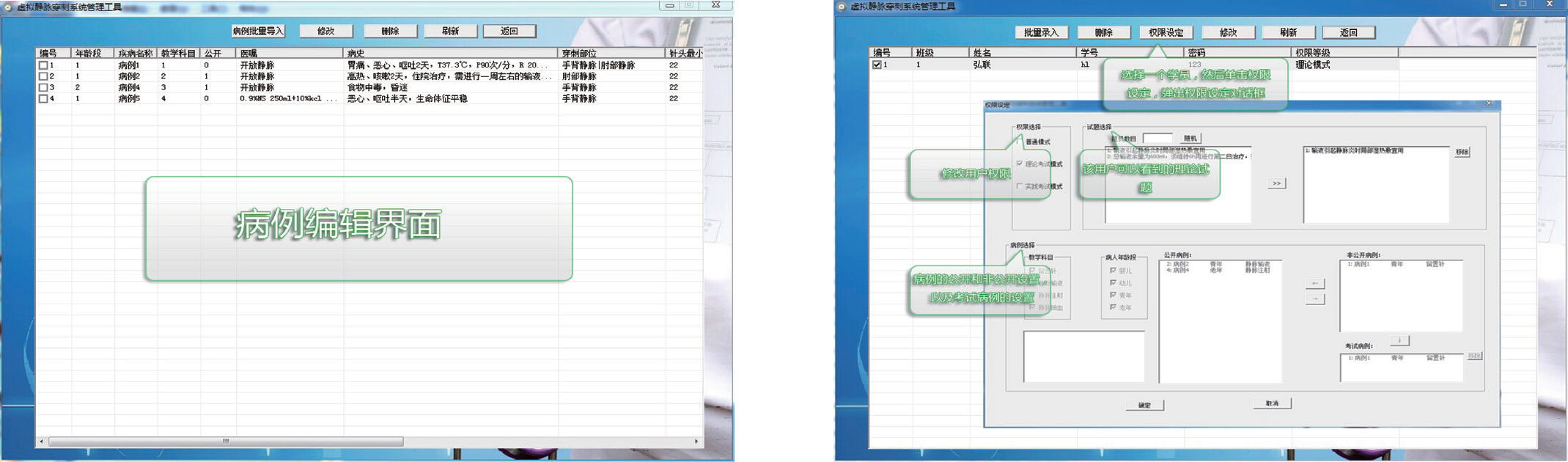 网络化管理系统:系统可分训练和考核模式,可单机使用也可多台组网使用。系统自带理论知识、视频操作讲解 智能管理系统:教师可对学员进行综合管理,包括学员增减、权限设置、病例编辑、考题编辑、考分查询等。 系统包括 显示真实病患的基本信息:姓名、性别、年龄、医嘱、病史、操作时间等信息。能够自行选择添加任意的准备 设备、并能够自行添加设备等并可根据真实的病例选择不同型号的穿刺针、留置针、头皮针等,不同器械的选择,会启 动不同的后续流程和不同的评判的标准。