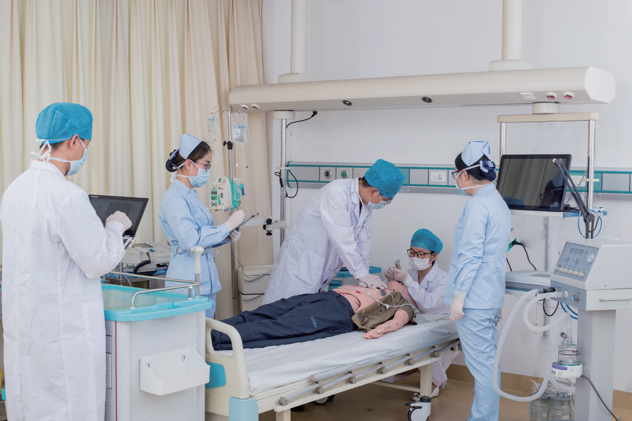 可配合使用真实的呼吸机、真实的 心电监护仪、真实的12导联心电图机、真实的除颤起搏监 护仪等医疗设备;
