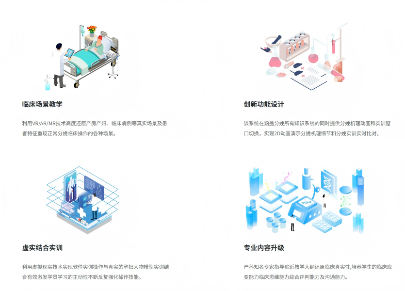 基于教材编制开发,由业内知名专家指导,通过高度还原临床产房助产的真实情境,以不同视角不同维度真实模拟助产全过程并提供交互式实训操作。系统覆盖了分娩机制、正常分娩、异常分娩等内容,将抽象的内容三维形象化,学生可以对难理解、难掌握的知识点进行反复操作学习,强化操作技能。