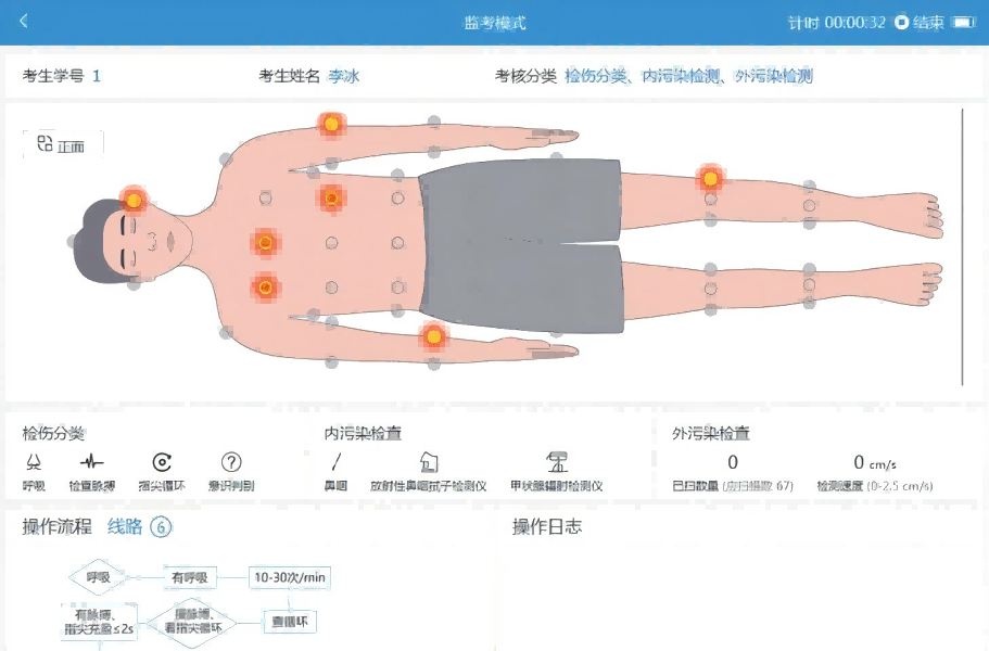 教师系统分监考模式、模拟人设备、系统设置、成绩统计,教师登录后 可对模拟人伤情、各检测点污染程度、训练考核内容和分值进行设定, 对学员考核过程进行实时监考。 学员系统分自选择训练和考核模式。在训练模式下,系统提示学员按标 准操作流程进行操作,可对学员进行同质化训练。在考核模式下,系统 可对学员的操作进行自动化评分。可显示当前训练的项目,并且在操作 流程中显示检伤分类的流程图。所有的操作都将在操作日志中显示。